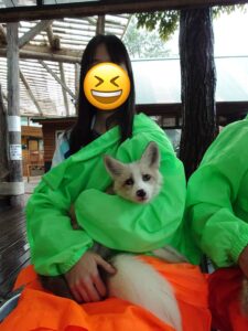 さて、今回ハンナ先生が訪れたのは宮城県です。そして送っていただいたのは、「宮城蔵王キツネ村」での写真です。ワトル英語塾のホームページを見ていただければわかると思いますが、ハンナ先生は大の動物好きです。100匹以上のキツネを見ることができる動物園とあっては、彼女にとって外すことができない観光地ですね。