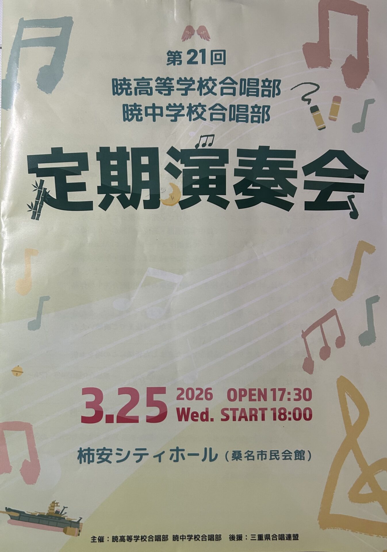 来年度は、2027年3月25日(木)に今回と同じ桑名市柿安シティホールで18時に開演予定です。暁学園合唱部は今年全国大会「全国声楽アンサンブルコンテスト(福島県福島市)」に出場し入賞するほどの強豪校です。是非皆さんにも彼らの素晴らしい歌声を聴いていただきたいです。