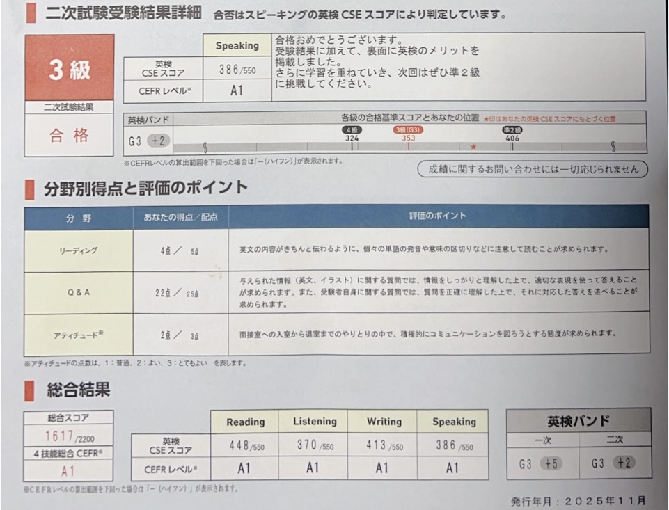 こんにちは、ワトル英語塾の山下です。2025年度第2回実用英語技能検定の合否結果が出ました。ワトル英語塾にもうれしい報告が届いています。現在中学2年生のY君も今回の受験で見事3級に合格しました。Y君は入塾してからコツコツと努力をして5級、4級、3級と合格してきました。彼は勉強だけでなく部活にも精を出していますが、どんなに忙しくても授業や宿題に手を抜くことは全くなく確実に前に進んできました。